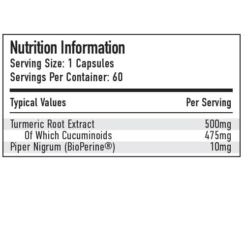 INGREDIENTS: Tumeric Extract (95% Curcuminoids), Rice Flour, Magnesium Stearate, Piper Nigrum (BioPerine®) Hydroxypropyl Methylcellulose Capsule. No common allergen added.
